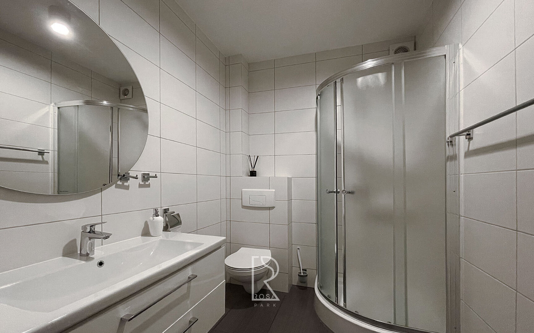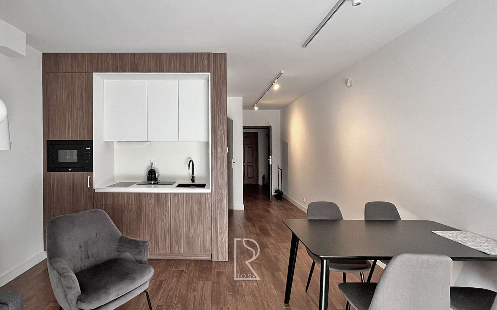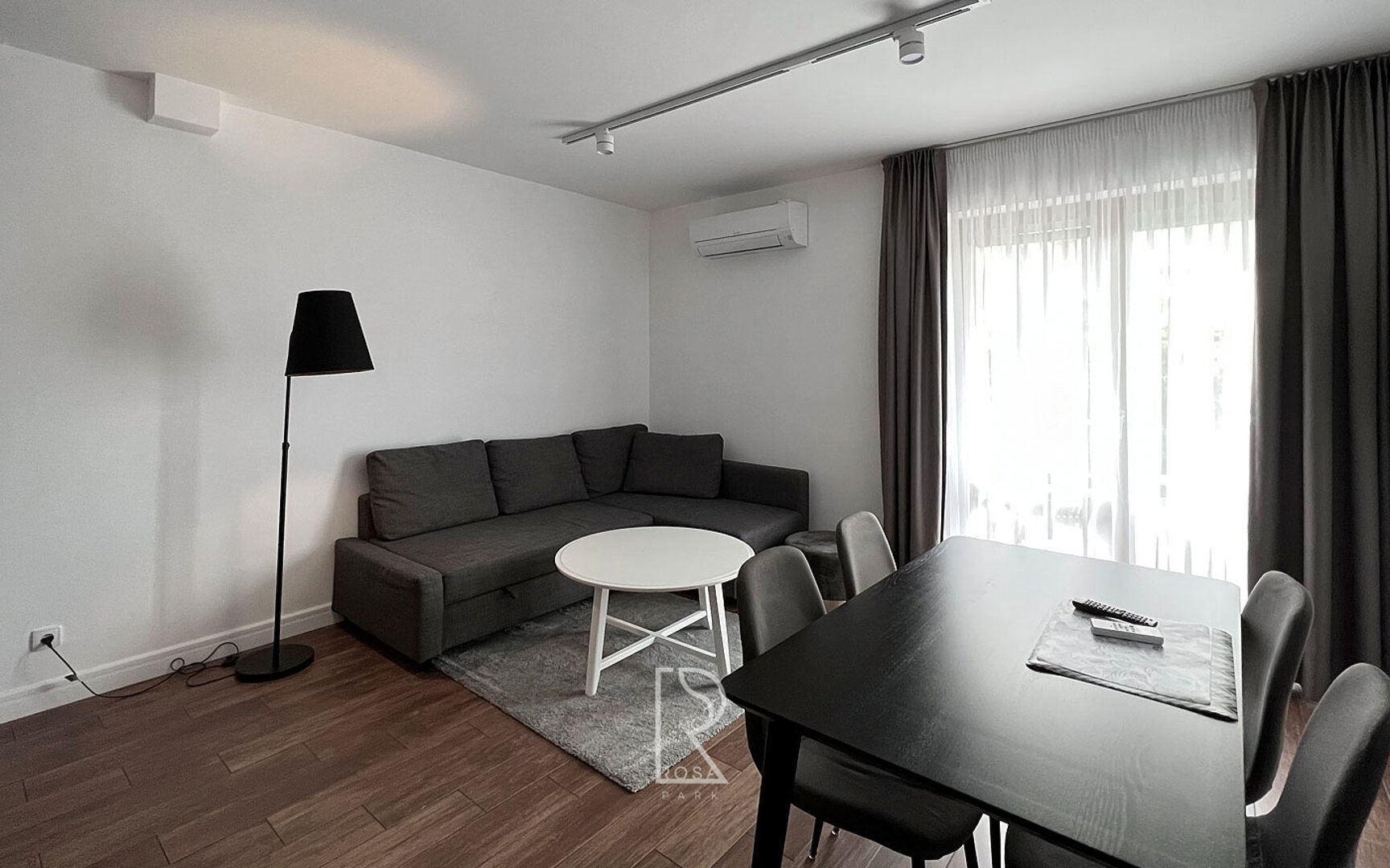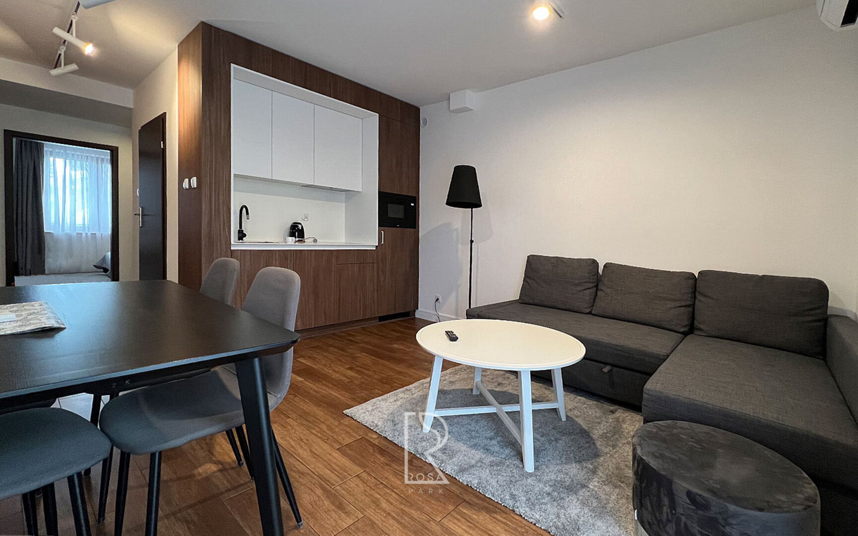 Funkcjonalnie wyposażony, klimatyzowany apartament na piętrze z własną łazienką, salonem, aneksem kuchennym i sypialnią.