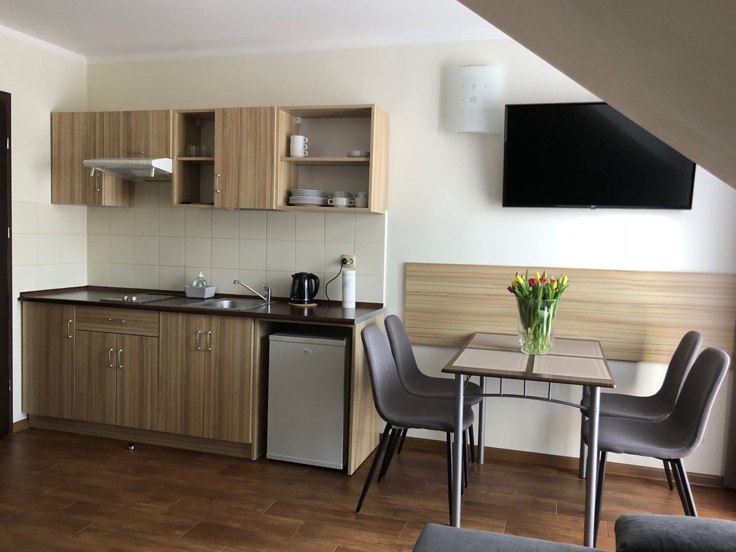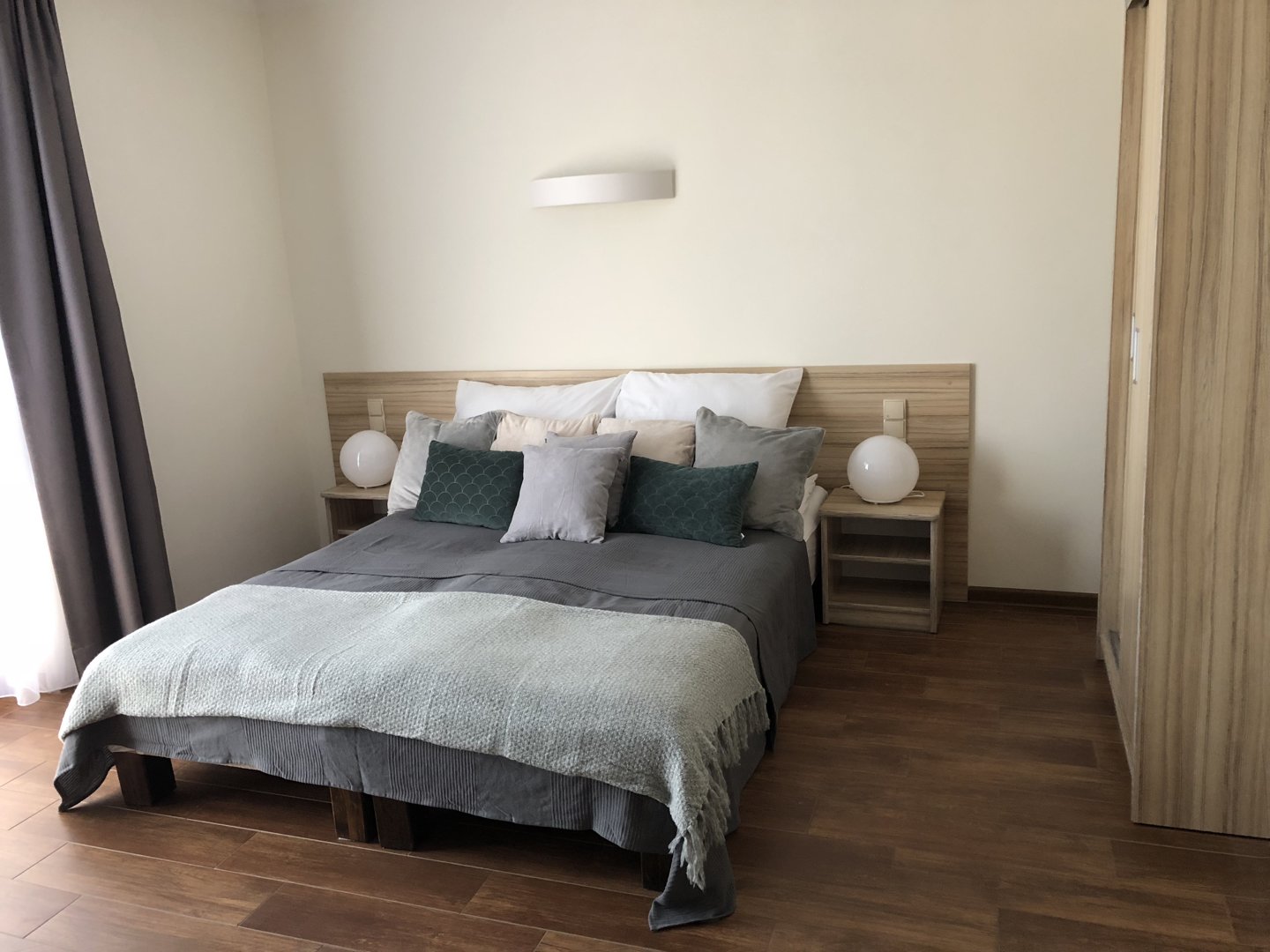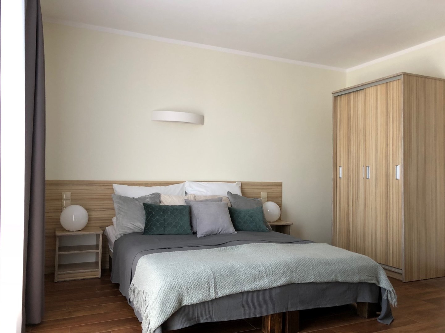 Funkcjonalnie wyposażony, klimatyzowany apartament na parterze z własną łazienką, salonem, aneksem kuchennym i sypialnią.
