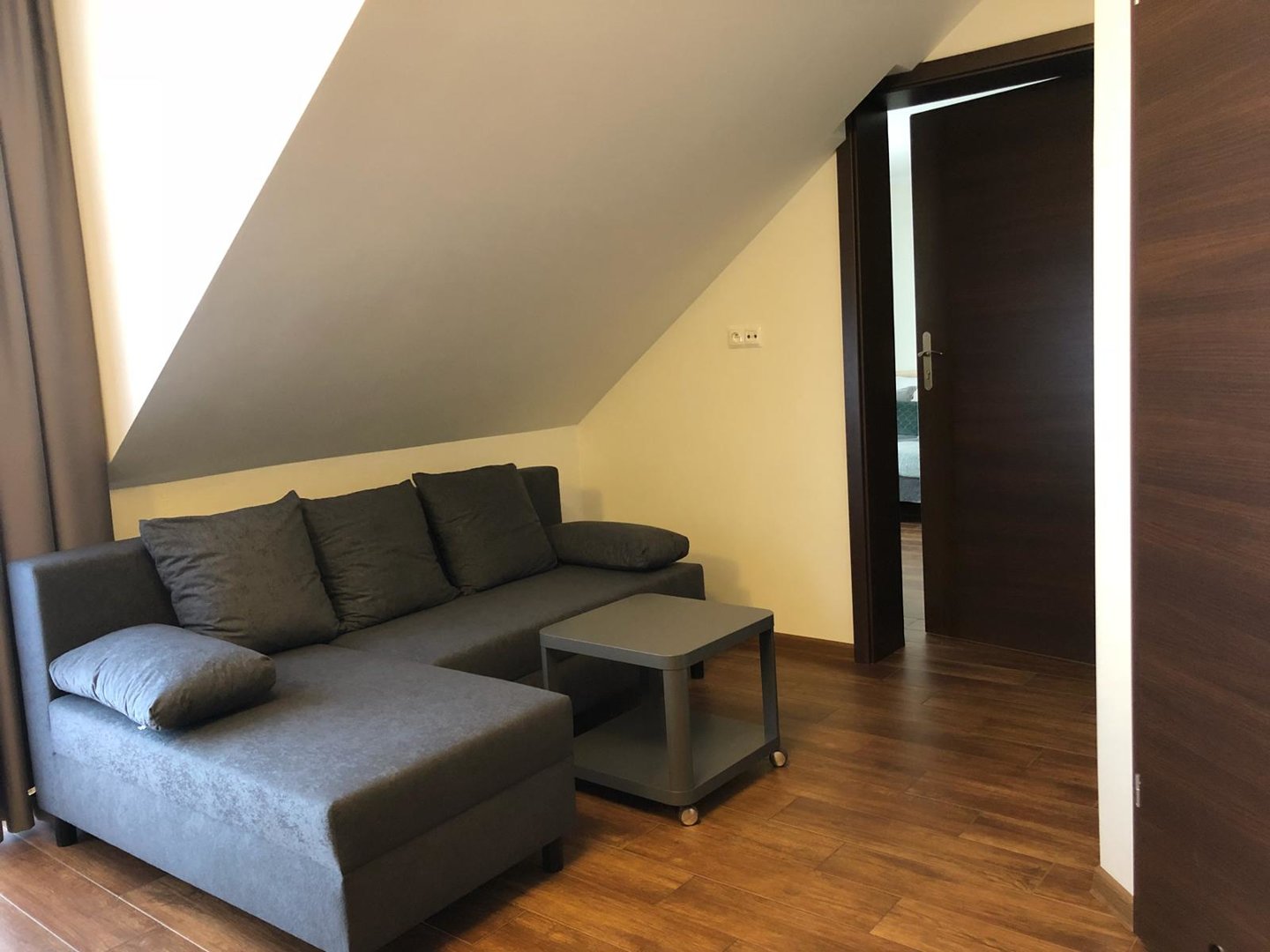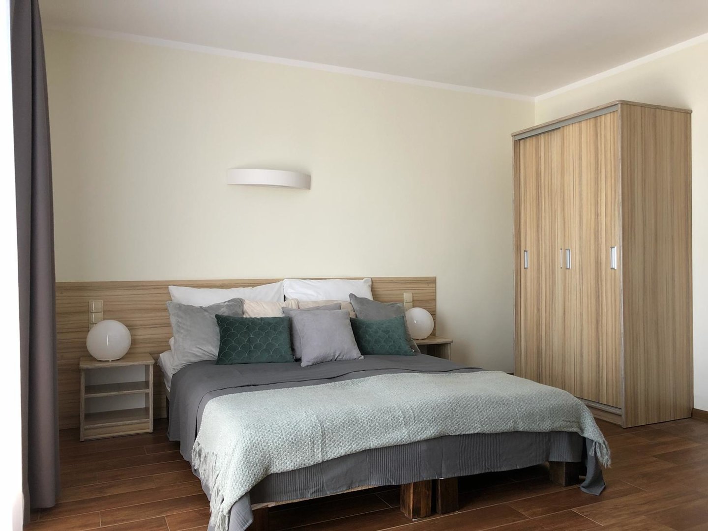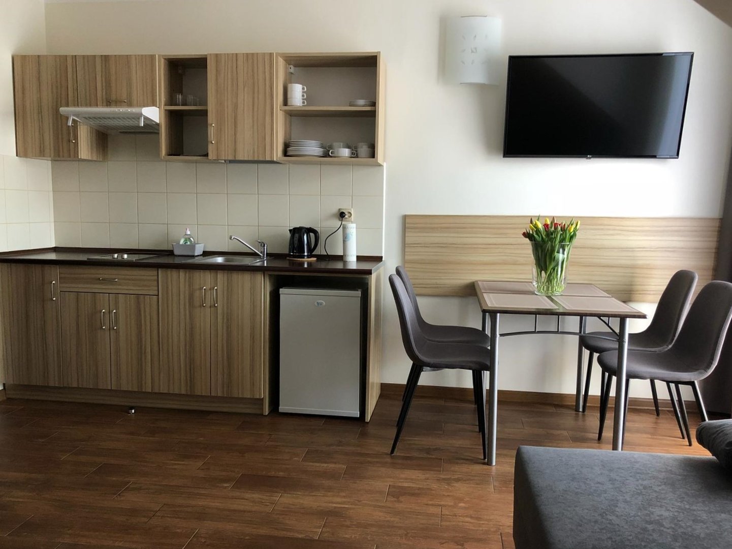 Funkcjonalnie wyposażony, klimatyzowany apartament na parterze z własną łazienką, salonem, aneksem kuchennym i sypialnią.